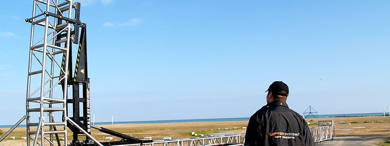 The GSLS does not need people or cranes pushing the tower: everything is done using the control panel located in the flight case.